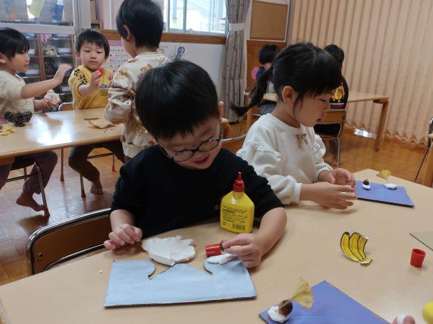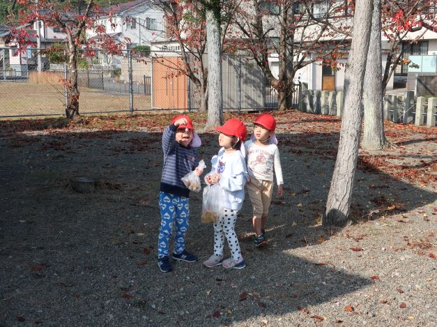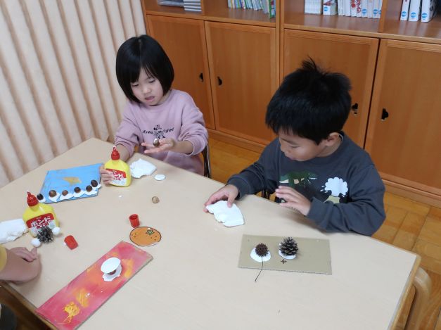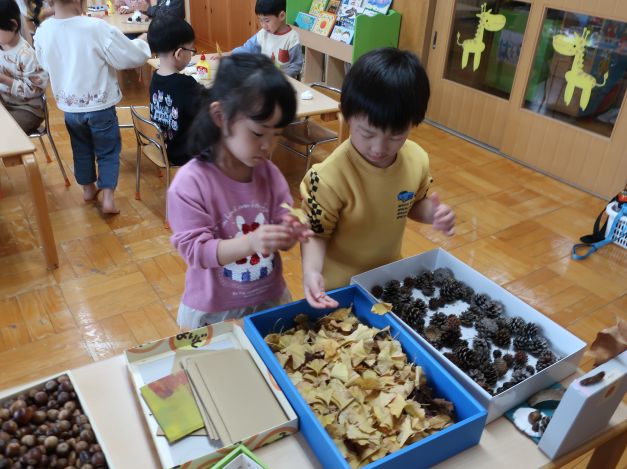 後日、散歩で持ち帰った葉と別の場所で集めた木の実を使って、自然物製作を楽しみましたよ。