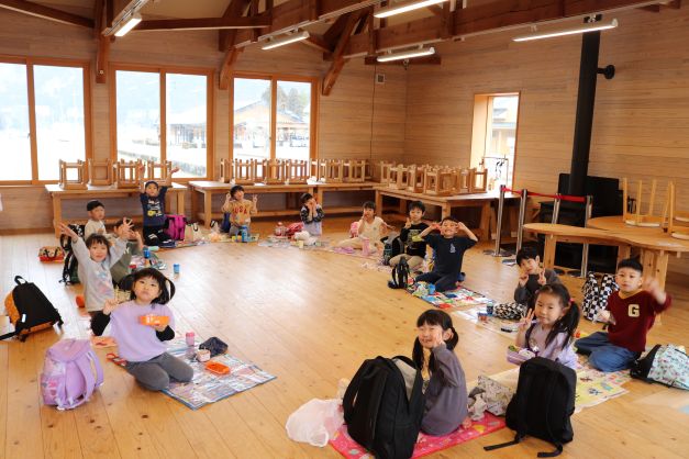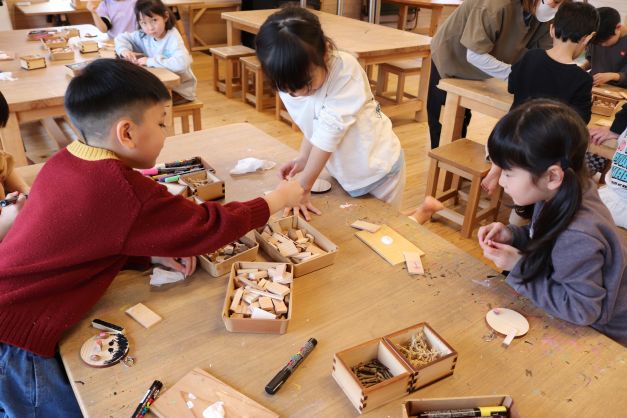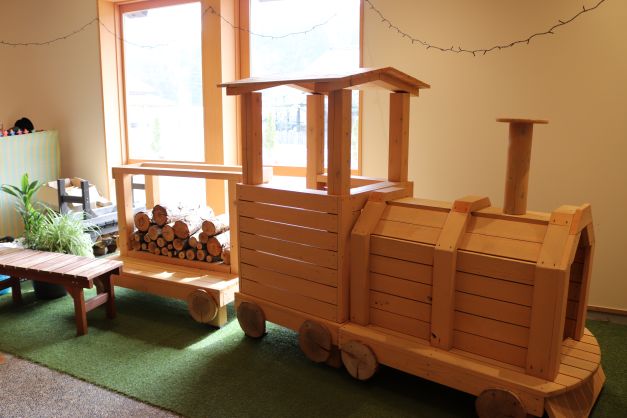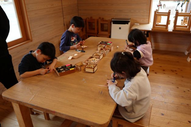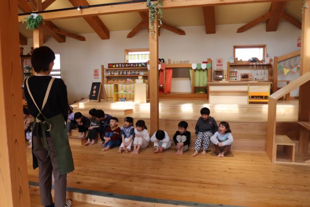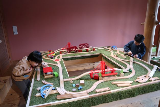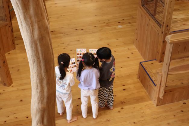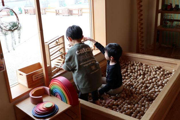 施設は木の香りに包まれていて、自然素材のおもちゃの心地よさを感じている様子でした。