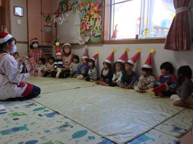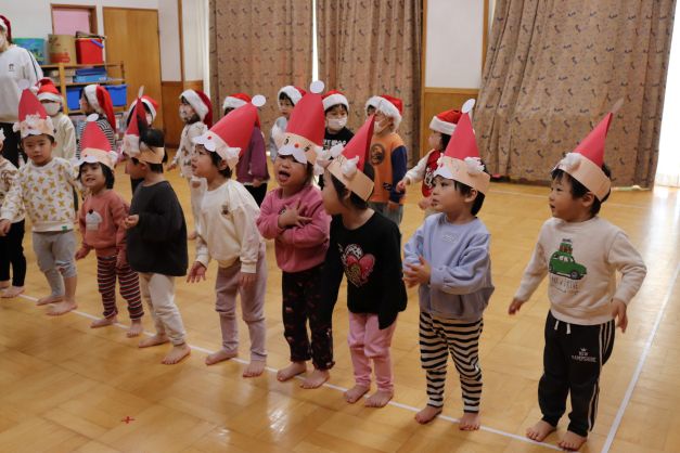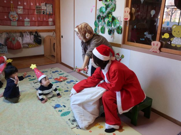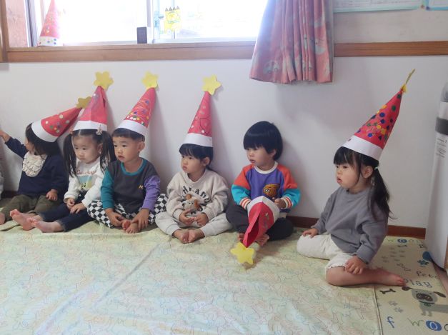 0.1歳児クラスさんは、手作りのサンタ帽を被ってサンタさんの登場を待っています♪