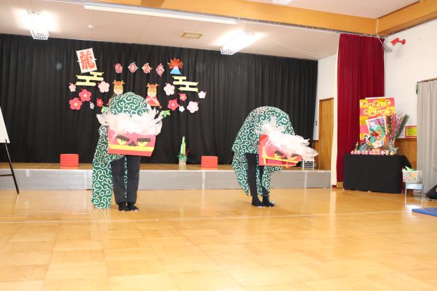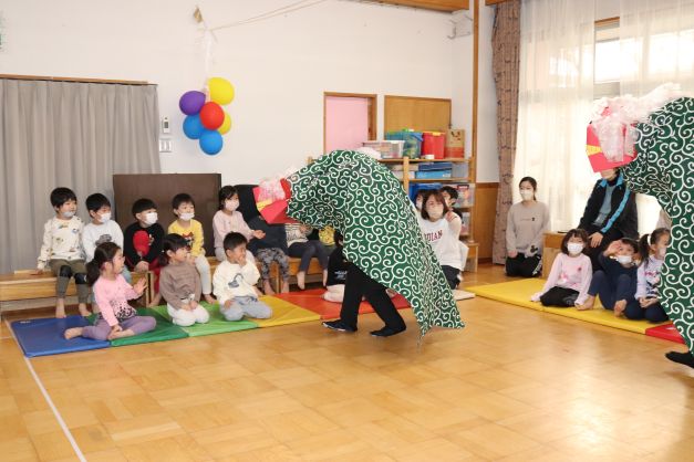 太鼓の音に合わせて動き踊る獅子舞の姿に、少々驚きの表情の子ども達でしたが、