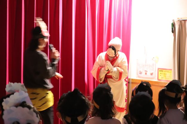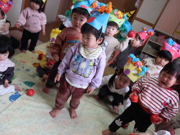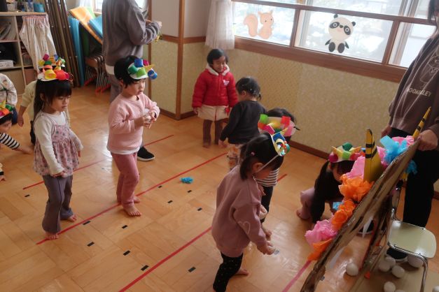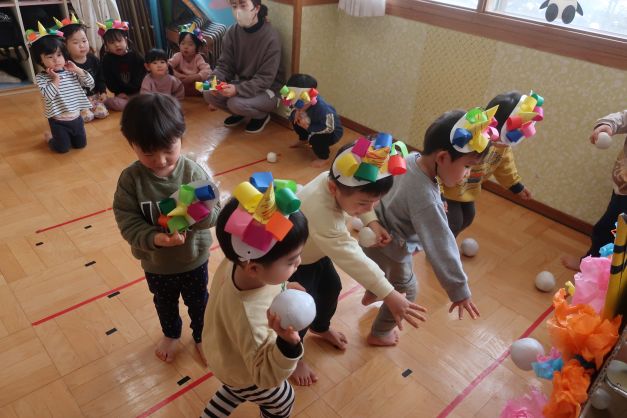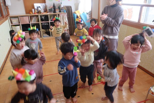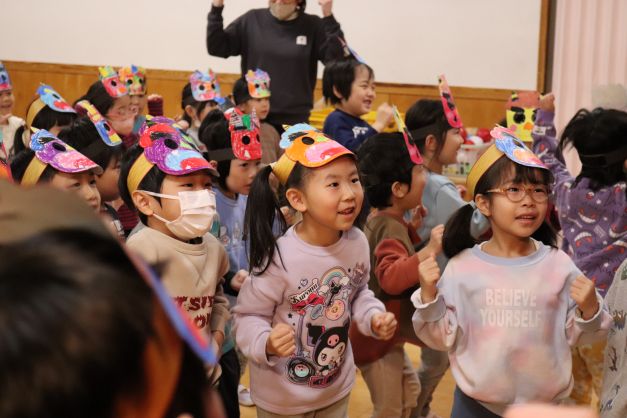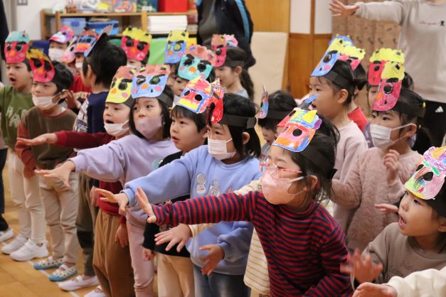 子どもたちは、かわいらしい鬼のお面をつけて、節分の雰囲気を楽しみました。