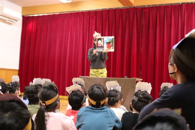 みんなでオニの歌を歌いました。元気な『鬼のパンツ』がホール中に響きニコニコ楽しい時間でした。